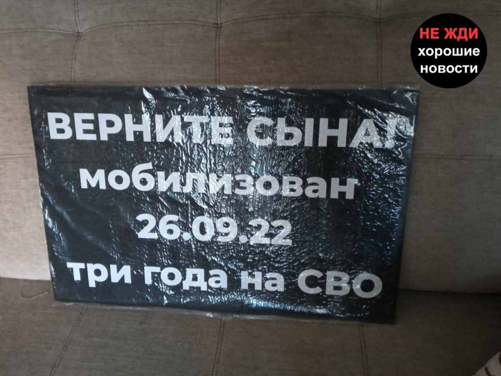 Женщина вышла с плакатом с надписью: “Верните сына! Мобилизован 26.09.22 три года на СВО” и провела пикет на Первомайской площади Абакана, напротив дома правительства республики.