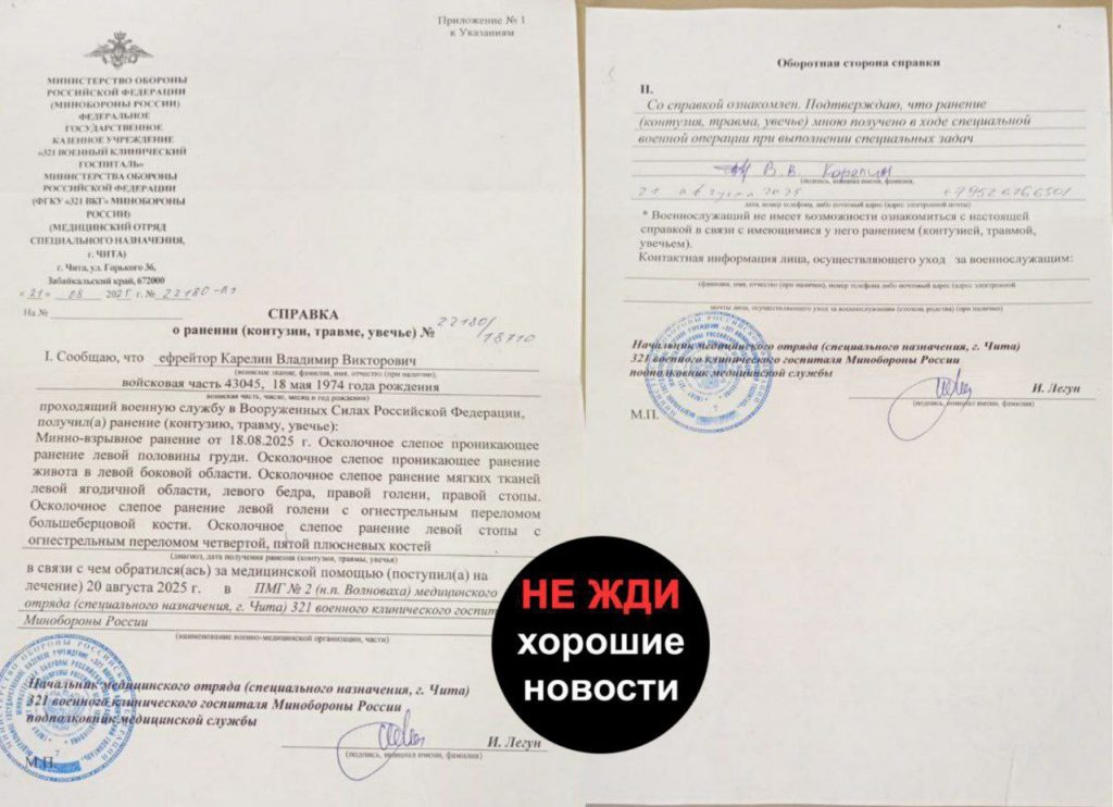 Племянница военнослужащего Карелина Владимира Викторовича, 18.05.1974 г.р., проходящего службу в в/ч 43045, записала видеообращение, в котором сообщила, что во время выполнения боевого задания он получил тяжёлое осколочное ранение — осколок находится в лёгком, рядом с сердцем. Также он получил ранение в ногу.