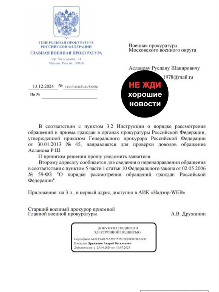 Руслан Асланов обращается к Президенту РФ Владимиру Путину с просьбой поспособствовать его переводу в другое подразделение, а компетентные органы отреагировать на его заявления.