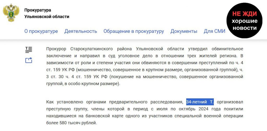 В июне-июле 2024 года организатор группы — депутат Старокулаткинского городского поселения от «Единой России» и глава местного отделения «Молодой гвардии» Газинур Шамилевич Тимушев вместе с координатором ульяновского филиала фонда «Защитники отечества» Ильдаром Расимовичем Курмакаевым под ложными предлогами уговорили знакомого подписать контракт с Минобороны. В фонде Курмакаев отвечал за «патриотическое воспитание граждан«, помогал оформлять контракты участникам СВО и отчитывался в соцсетях об отправке гуманитарной помощи на фронт. После ухода знакомого на службу мошенники похитили 580 тысяч рублей со второго экземпляра его банковской карты.