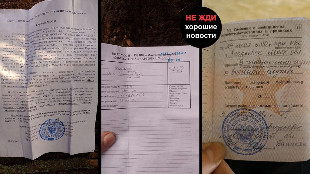 Во время нахождения Олега в “яме” представители полка через психиатра Луганского военного госпиталя пытались изменить категорию годности, чтобы допустить его к штурмовым действиям. Однако в Белгородском госпитале диагноз и категория годности были подтверждены, у бойца есть соответствующие документы.