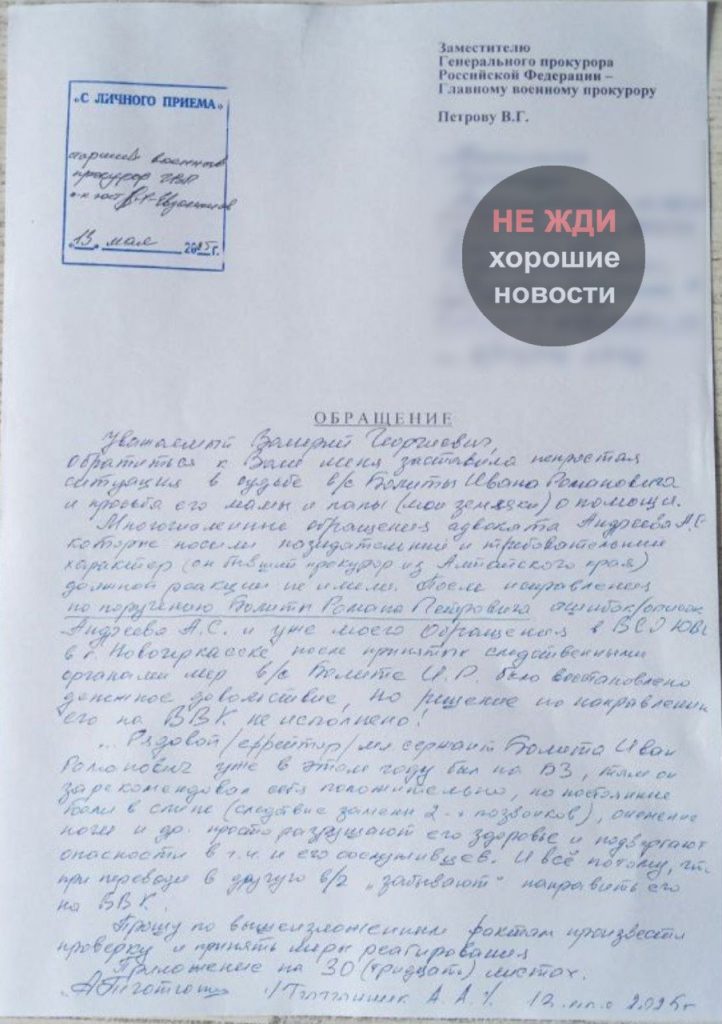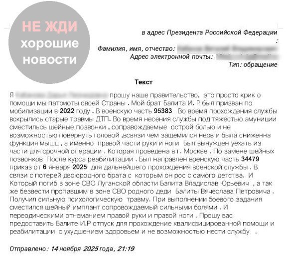 “Прошу наше Правительство, это просто крик о помощи <...> прошу Вас предоставить Балите Ивану Романовичу отпуск для прохождения квалифицированной помощи и реабилитации в связи с ухудшением здоровья и невозможностью нести воинскую службу”