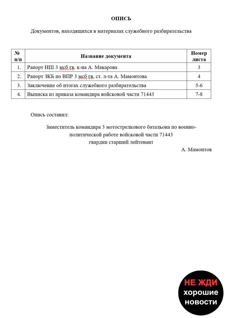 Сейчас нам были переданы документы, а также голосовые сообщения начальника штаба 3-го батальона Артёма Макарова. Установлено, что при общении Макарова с командиром батальона и другими должностными лицами никак не опровергается факт значительных потерь в подразделении, основное внимание уделяется поиску источника утечки информации.