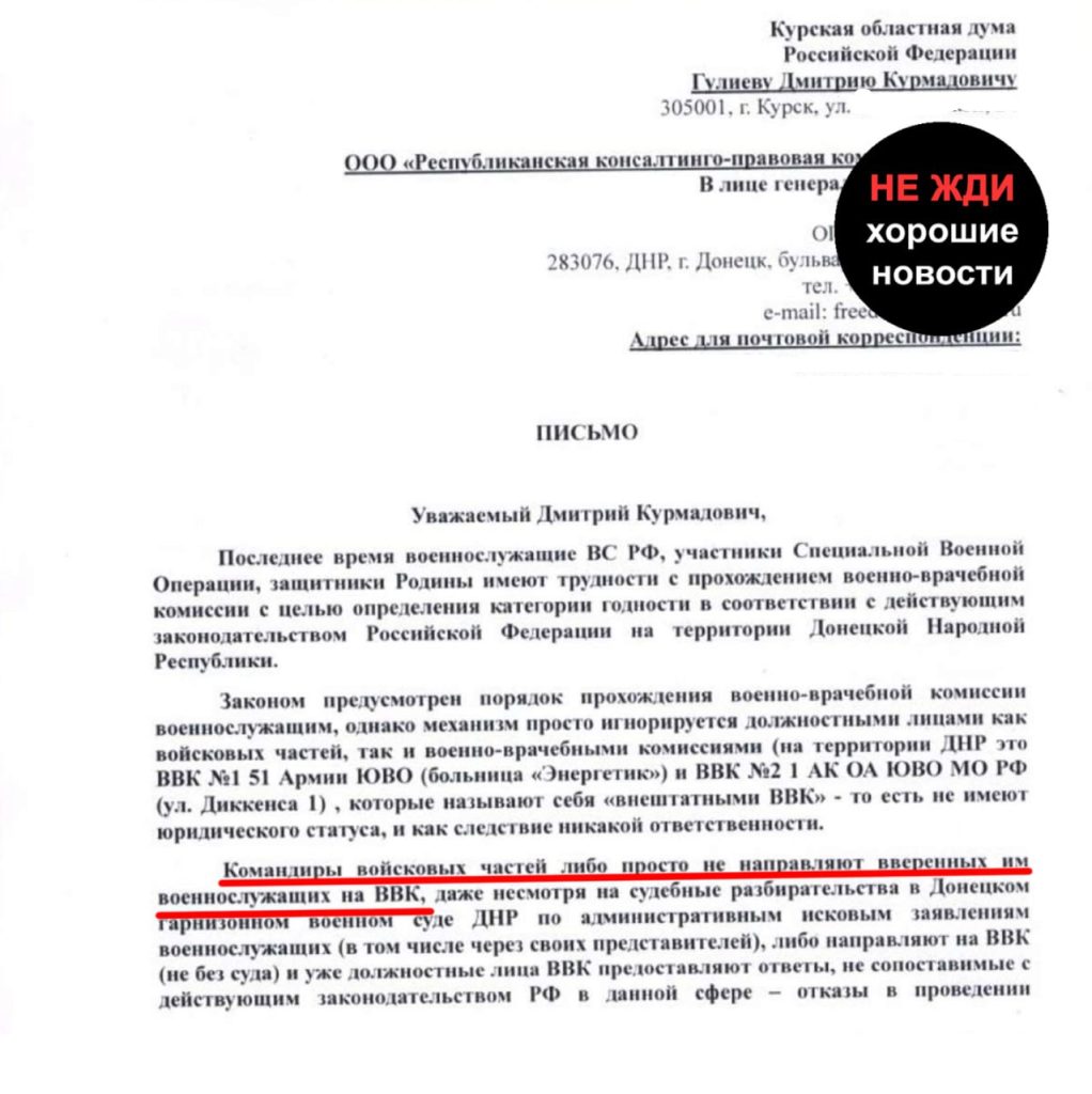 Юрист Роман Подниглазов сообщил, что было подано обращение к депутату Курской областной Думы Дмитрию Гулиеву с просьбой обратить внимание на нарушения прав военнослужащих, связанные с отказом в прохождении ВВК.
