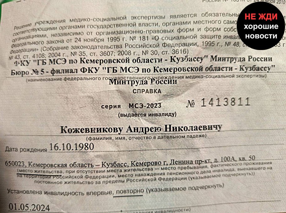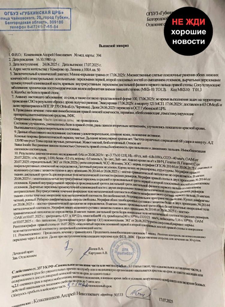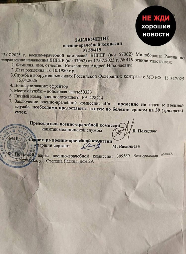 Сын военнослужащего 122-го мотострелкового полка (в/ч 50333) Кожевникова Андрея Николаевича, 16.10.1980 г.р., сообщил о том, что отца отправили на передовую несмотря на состояние его здоровья. Андрей неоднократно получал ранения за время службы. После очередного ранения раздробленную кость в ноге восстановить не удалось. Кроме того, не были извлечены осколки из ног. В результате боец не может нормально передвигаться, ему была установлена инвалидность второй группы.