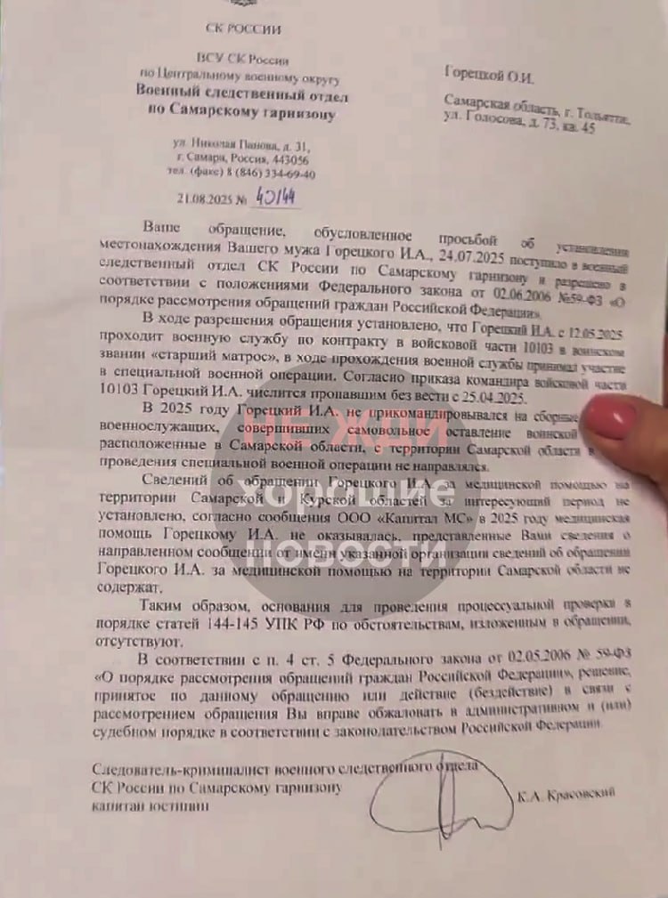 Олеся уточнила, что они обратились в информационный центр СК, где ее обращение было направлено на Камчатку, в Тихоокеанский флот, 8 сентября 2025 года обращение было зарегистрировано в следственном отделе. 22 сентября пришел ответ на обращение, только уже от другого следователя. Такового ответа, по сути, она так и не получила. Вскрытый конверт с документами пришел женщине 22 сентября.