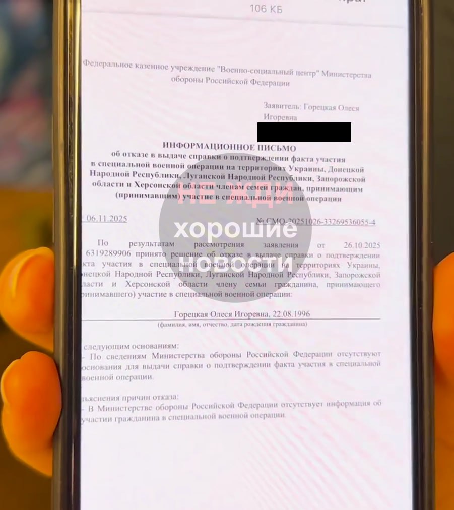 Горецкая Олеся, жена военнослужащего 40-й отдельной гвардейской бригады морской пехоты (в/ч 10103) Горецкого Ильи Анатольевича, рассказала, что уже полгода не может добиться от государственных структур каких-либо четких сведений о своем муже. По ее словам, в одних документах он значится пропавшим без вести, а в других — будто вообще не участвовал в СВО, из-за чего ей отказывают в справках и предоставлении какой-либо информации.