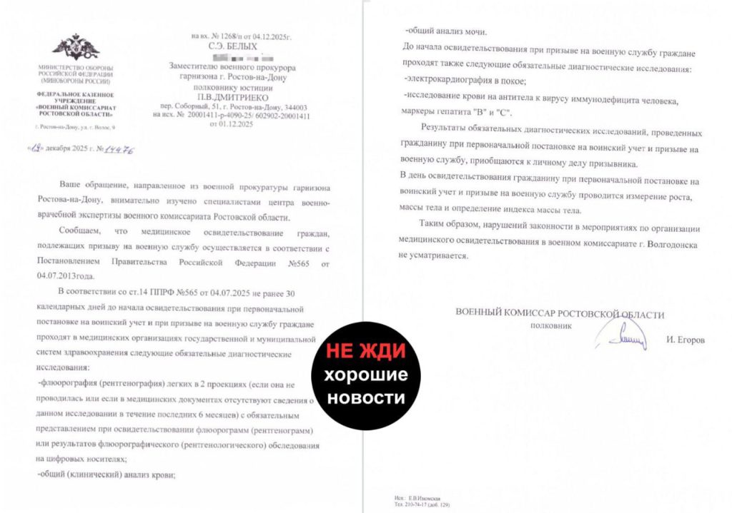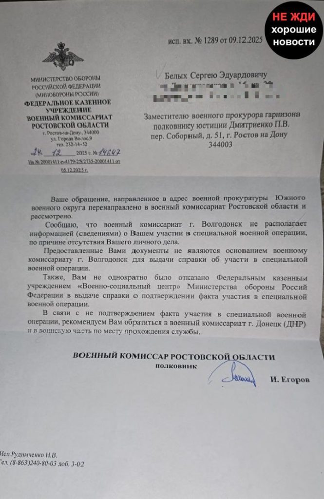 Сергей сообщил, что обратился в военную прокуратуру. 19 декабря 2025 года ему поступил ответ из областного военкомата за подписью полковника Егорова. В письме сообщалось, что нарушений не выявлено. 24 декабря поступил ещё один ответ, в котором указано, что факт его участия в СВО «не подтверждён», и ему предложено обращаться в военкомат Донецка.