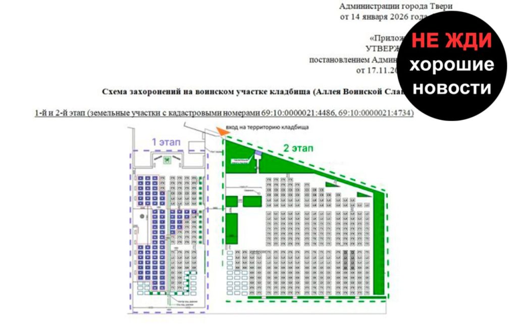 Администрация города Твери 14.01.2026 подписала постановление о внесении изменений в постановление от 17.11.2023 № 779 “Об определении места захоронения военнослужащих, погибших при выполнении задач в условиях специальной военной операции…”