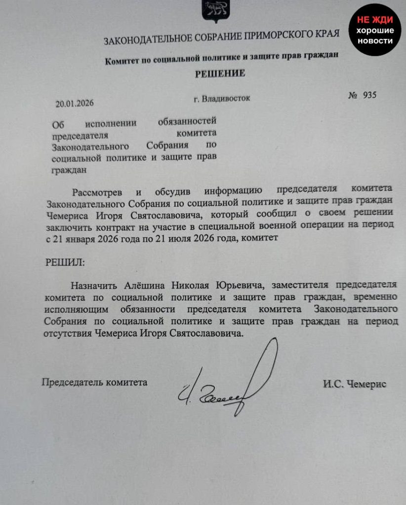 Глава социального комитета законодательного собрания Приморского края Игорь Чемерис на заседании сообщил коллегам о своем намерении отправиться в зону СВО. Депутат подписал контракт на шесть месяцев, служить будет в составе добровольческого отряда БАРС-33 на Херсонском направлении. По словам военного эксперта Алексея Суконкина, это направление имеет оборонительный характер, так как линия фронта проходит по Днепру.