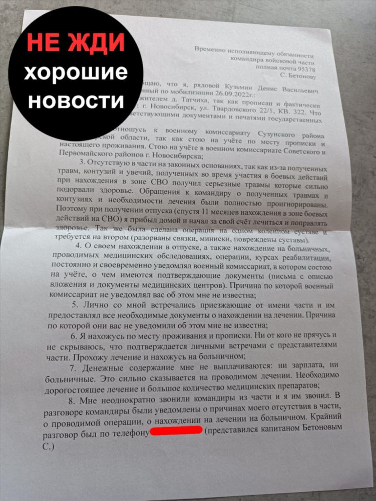 Отдельно родственники указывают, что Кузьмин лично встречался с представителями воинской части и докладывал о прохождении лечения. Также он общался по телефону с врио командира 1437-го полка капитаном Бетоновым Сергеем Сергеевичем, 16.04.1977 г.р., однако, это не повлияло на решение объявить его в СОЧ и впоследствии задержать.