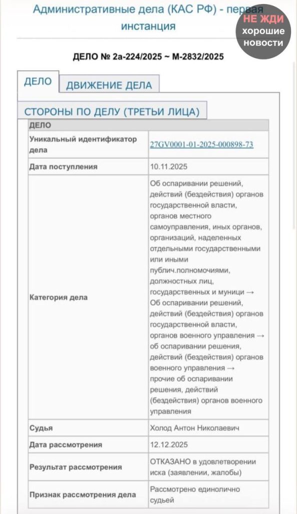 Елена Евгеньевна сообщила, что семья обратилась в суд и предоставила доказательства того, что контракт не был подписан добровольно. По её словам, в ходе разбирательства свидетели подтвердили факт принудительного подписания контракта, однако военный гарнизонный суд г. Хабаровска принял решение в пользу войсковой части.