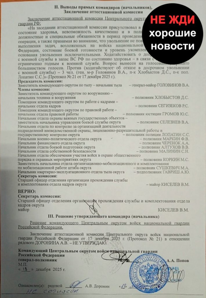 По словам женщины, 17 декабря 2025 года после рапорта Доронина часть и округ инициировали его увольнение, аттестационная комиссия проголосовала за увольнение, но окончательное решение было изменено руководством.