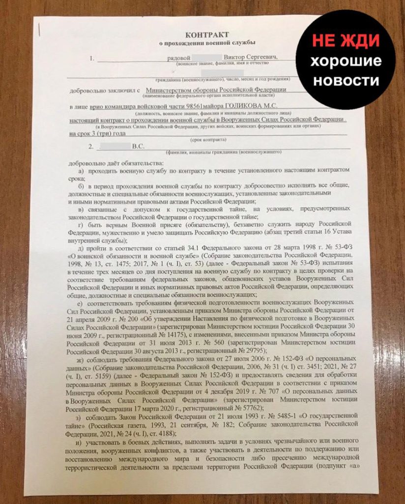 Это уже не первый подобный случай в в/ч 98561. В 2024 году родственники срочника Виктора Язвенко жаловались на то, что его под давлением принудили подписать контракт. Майор Голиков на тот момент выполнял обязанности командира части. В итоге 1 ноября 2024 года Виктора отправили в 143-й мотострелковый полк (в/ч 21634), 17 июля 2025 года он погиб. Тогда в командовании части тоже отрицали факт принуждения к подписанию контракта.