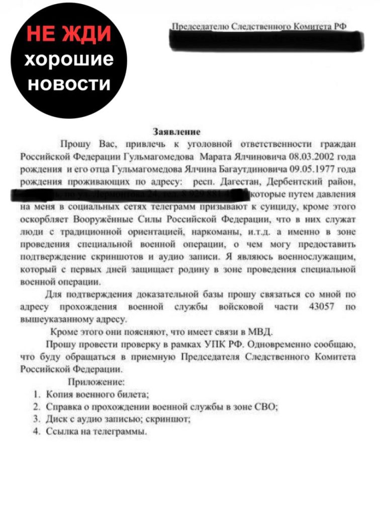 Чащина сообщила, что обращалась в МВД Дербента и направляла заявление в Следственный комитет России, однако ответа до сих пор не получила. По её словам, после обращений угрозы усилились и повторяются почти ежедневно.