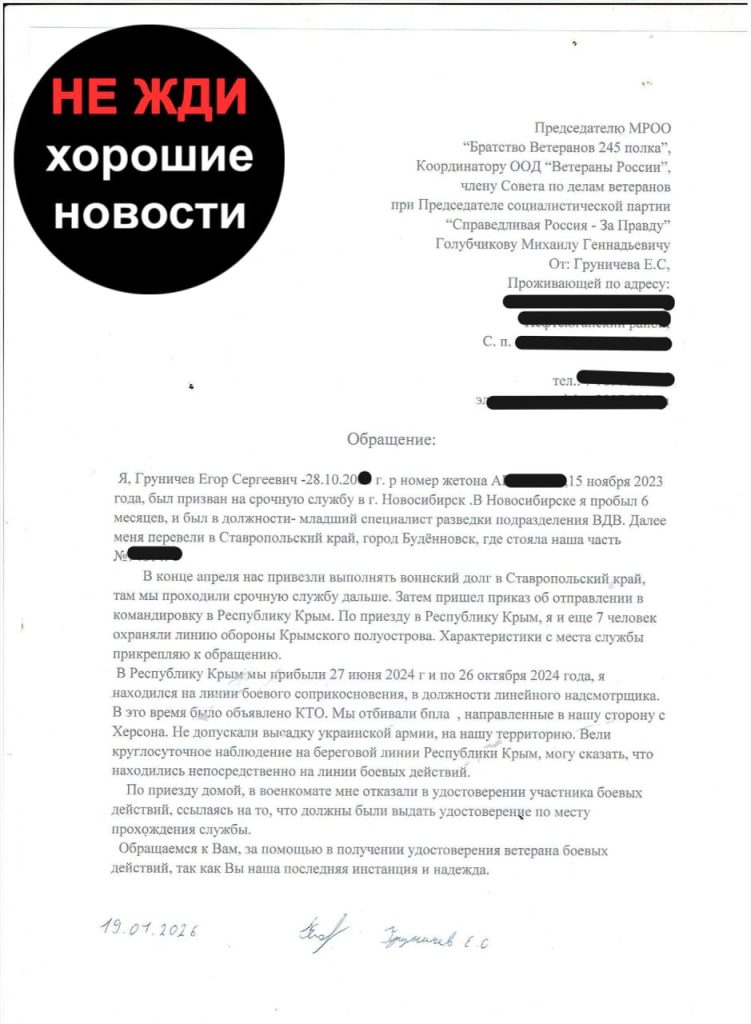 Военнослужащий срочной службы Груничев Егор Сергеевич, 28.10.2004 г.р., обратился к председателю МРОО “Братство ветеранов 245 полка” в связи с отказом в выдаче удостоверения ветерана боевых действий. 15 ноября 2023 года Егор был призван на срочную службу и проходил её в Новосибирске в должности младшего специалиста разведки подразделения ВДВ.