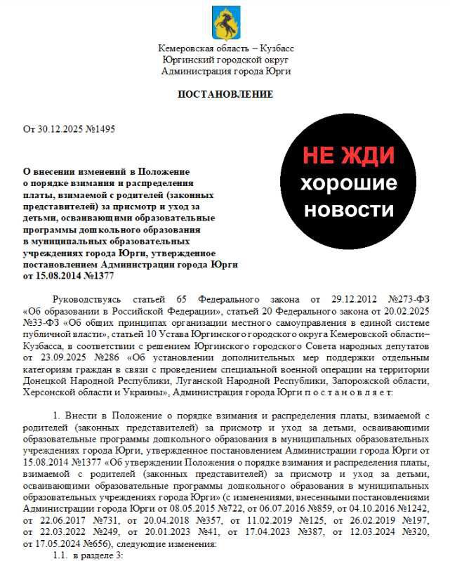 Муниципалитет Юрги существенно сократил льготы на оплату детских садов для семей участников СВО