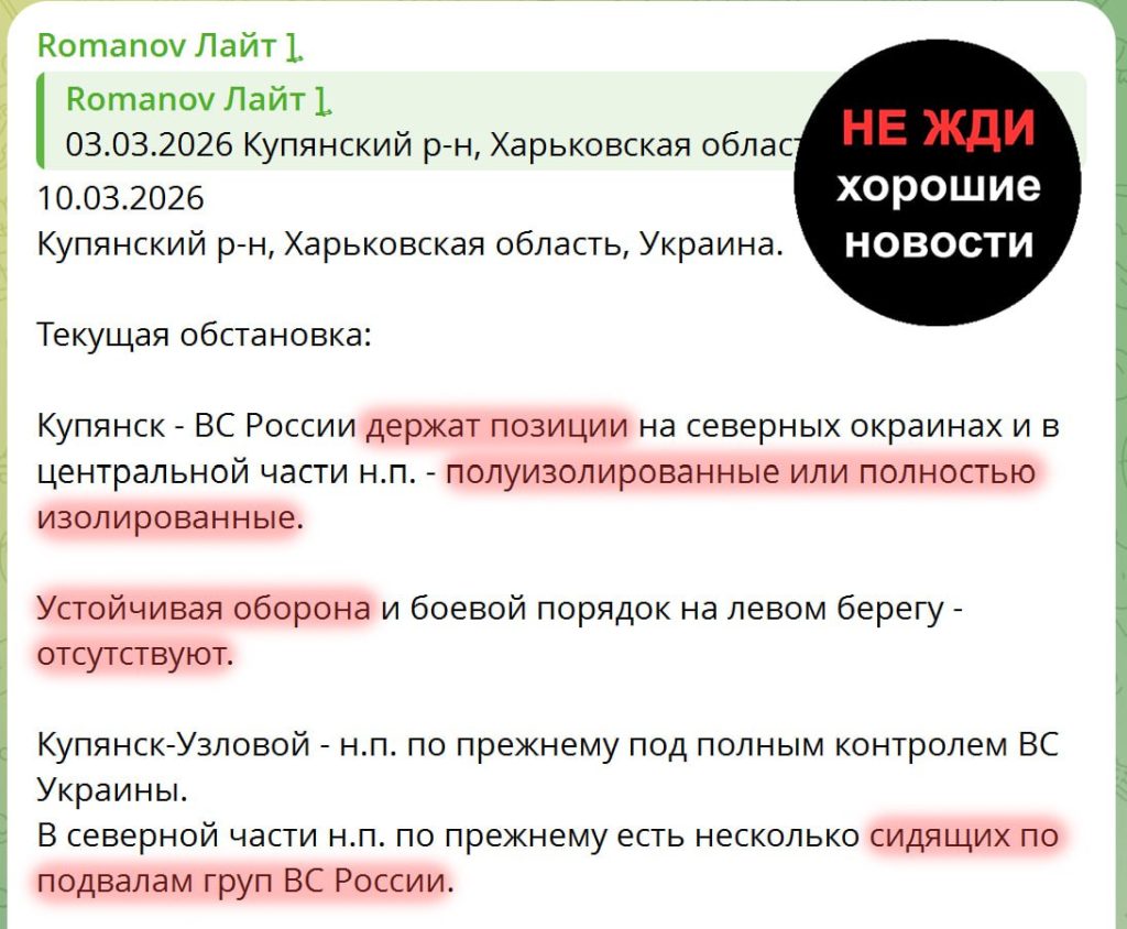“Купянск — ВС России держат позиции на северных окраинах и в центральной части н.п. — полуизолированные или полностью изолированные”