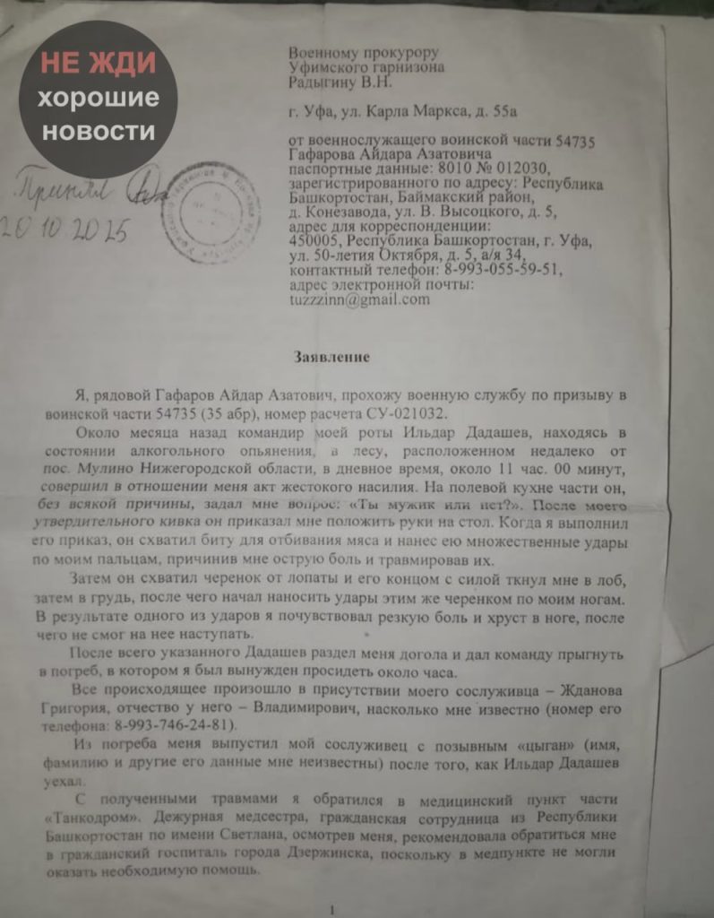 Гафаров Айдар Азатович, 28.08.1989 г. р., был жестоко избит командиром роты Эльдаром Дадашевым (позывной «Раптор»), после чего тот приказал ему раздеться догола, и военнослужащего поместили в погреб, где он пробыл около часа. В своём заявлении Гафаров написал, что Дадашев, находясь в состоянии алкогольного опьянения, наносил ему удары палкой и битой для отбивания мяса.