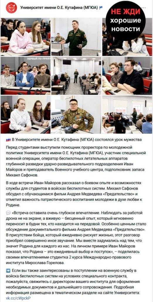 Полина, студентка колледжа при Московском государственном юридическом университете имени О. Е. Кутафина, рассказала об отправке студентов в зону СВО. Она указала на системную агитацию студентов к подписанию контрактов: в учебном заведении проводятся «уроки мужества» с участием военнослужащих, где молодых людей призывают отправляться на службу по контракту. Студенка заявила, что по крайней мере трое студентов уже были направлены в зону СВО.